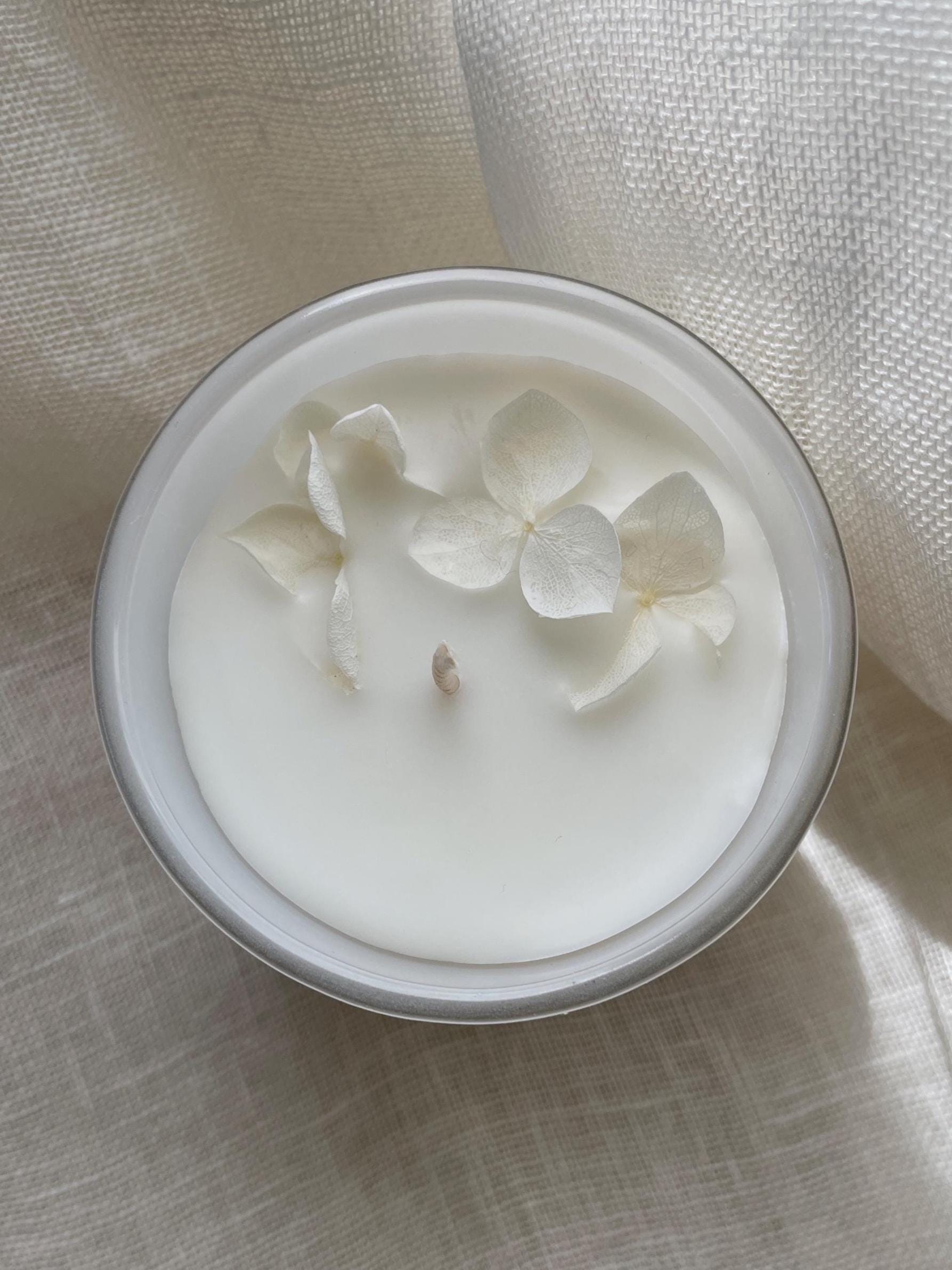 Finished with white dried hydrangea petals, this minimalist candle brings subtle beauty to any space — from your living room or bedside table to gift boxes and self-care rituals.