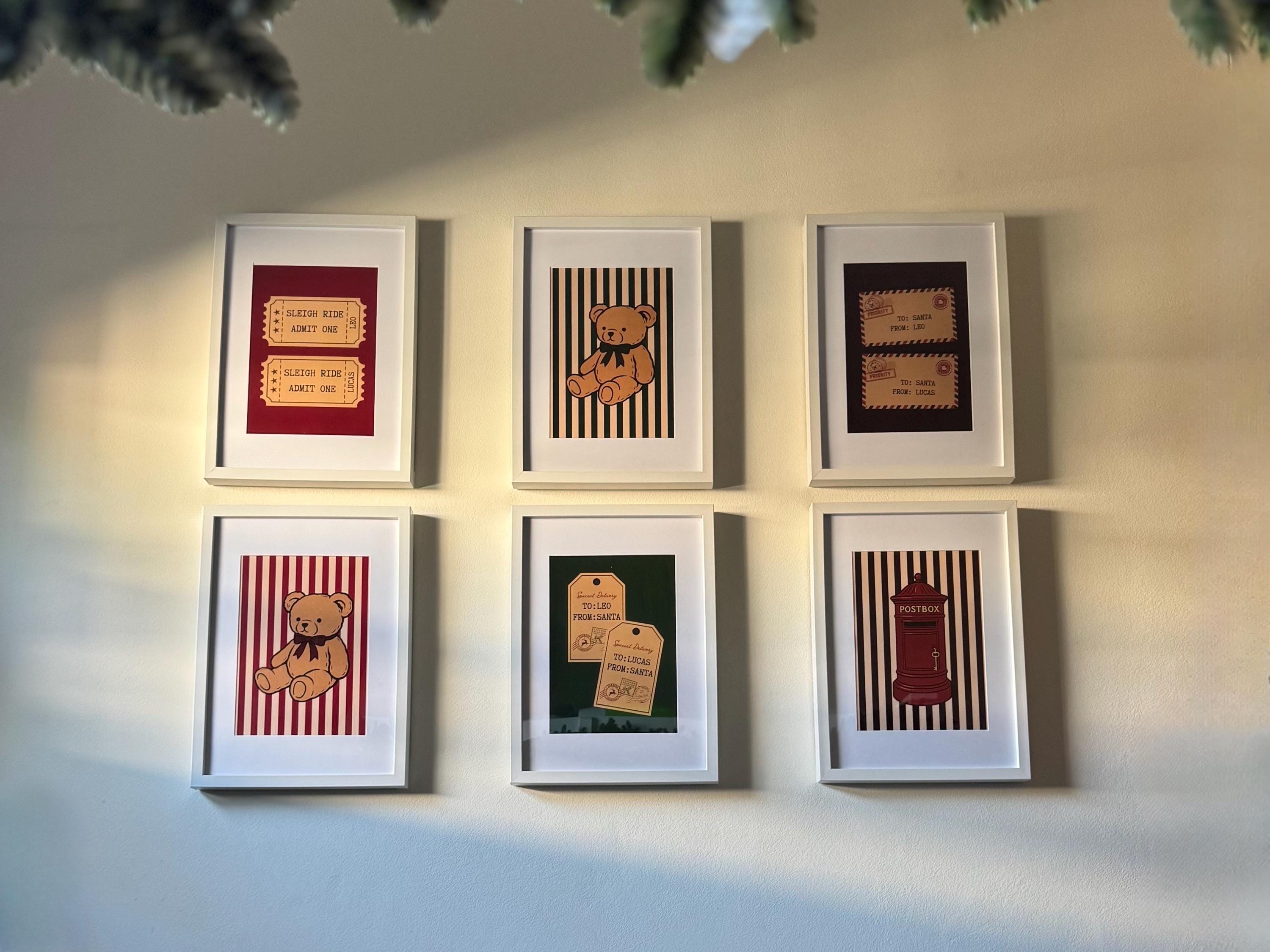 Lovingly designed with care, these original handmade posters bring festive charm and nostalgic beauty into your child’s world. Created for imaginative little ones full of Christmas hope and awe, each piece captures the wonder of the season with vintage-inspired illustrations of teddy bears, Santa’s letters, sleigh ride tickets, and festive postboxes.