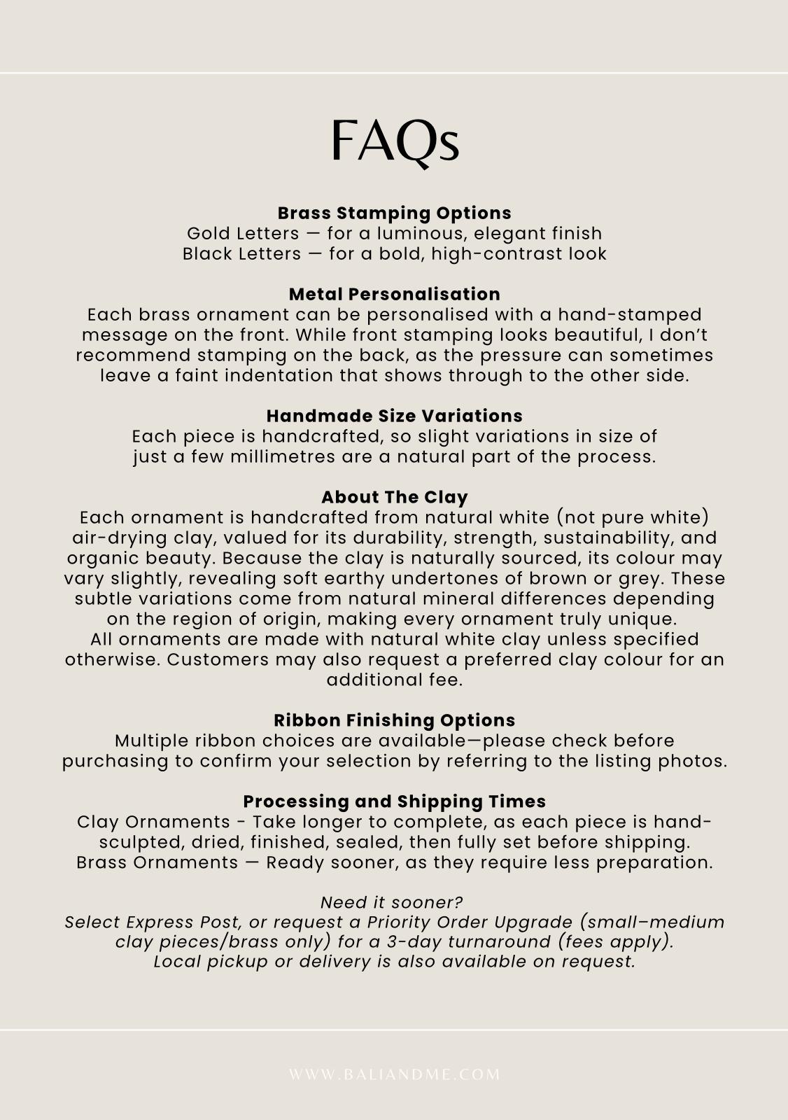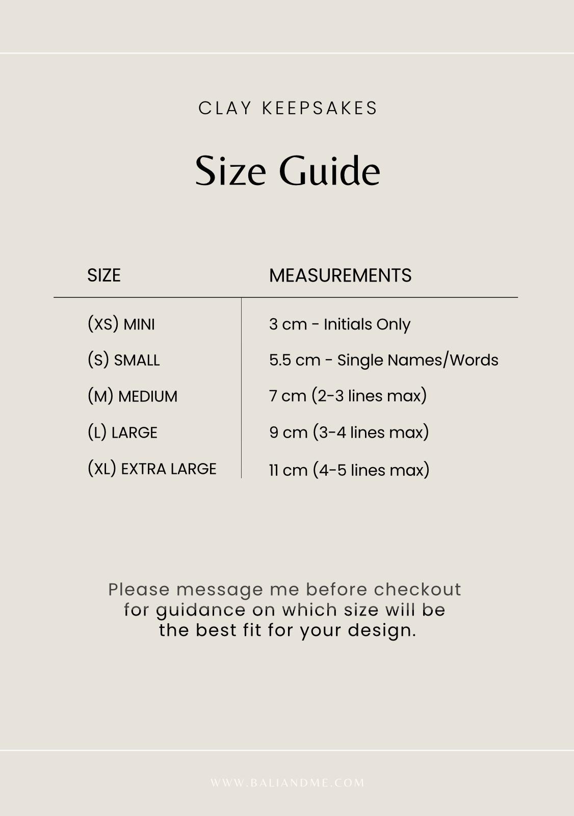 Due to the handmade nature of my clay keepsakes, slight size variations may occur — typically just a few millimetres. Each piece is individually crafted, making it truly unique, with its own natural charm and character. Please also note that colours may appear slightly different in photos due to variations in lighting, screen brightness, and monitor settings. Please refer to individual items for sizing information.